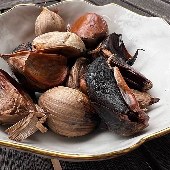 Schwarzer Knoblauch in praktischen Einzelzehen. Vollmundige Aromen von Dörrzwetschke, Balsamico-Essig und ganz leicht geröstetem Knoblauch. Letzte Schale abziehen und genießen. Der Knoblauch ist weich, er lässt sich gut aufs Brot streichen, in eine Sauce einarbeiten, kochen oder backen. Hergestellt ohne jede Zusatzstoffe in Bad Aussee, Österreich.